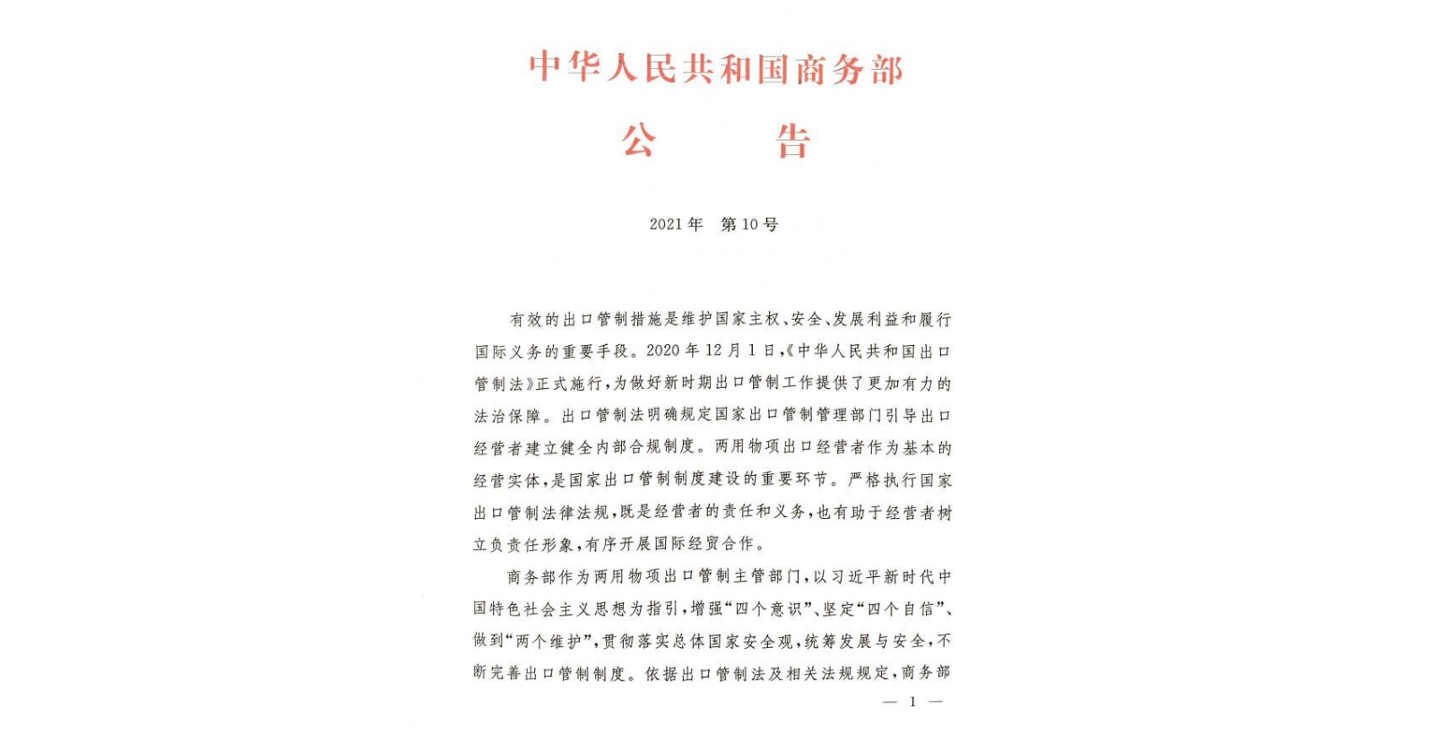 商務(wù)部2021年4月發(fā)布《商務(wù)部關(guān)于兩用物項(xiàng)出口經(jīng)營(yíng)者建立出口管制內(nèi)部合規(guī)機(jī)制的指導(dǎo)意見(jiàn)》及《兩用物項(xiàng)出口管制內(nèi)部合規(guī)指…